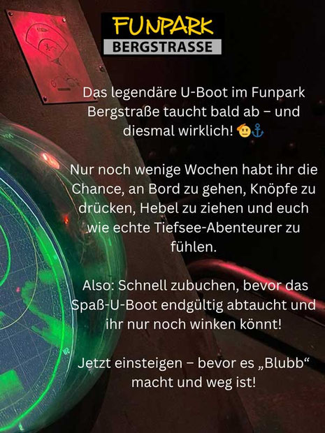 Im Funpark Bergstraße heißt es bald Abschied nehmen von einer unserer beliebtesten Attraktionen: dem legendären U-Boot! Nach vielen Jahren voller Spannung, Rätselspaß und vielen Fahrten taucht es nun endgültig ab – und diesmal wirklich.